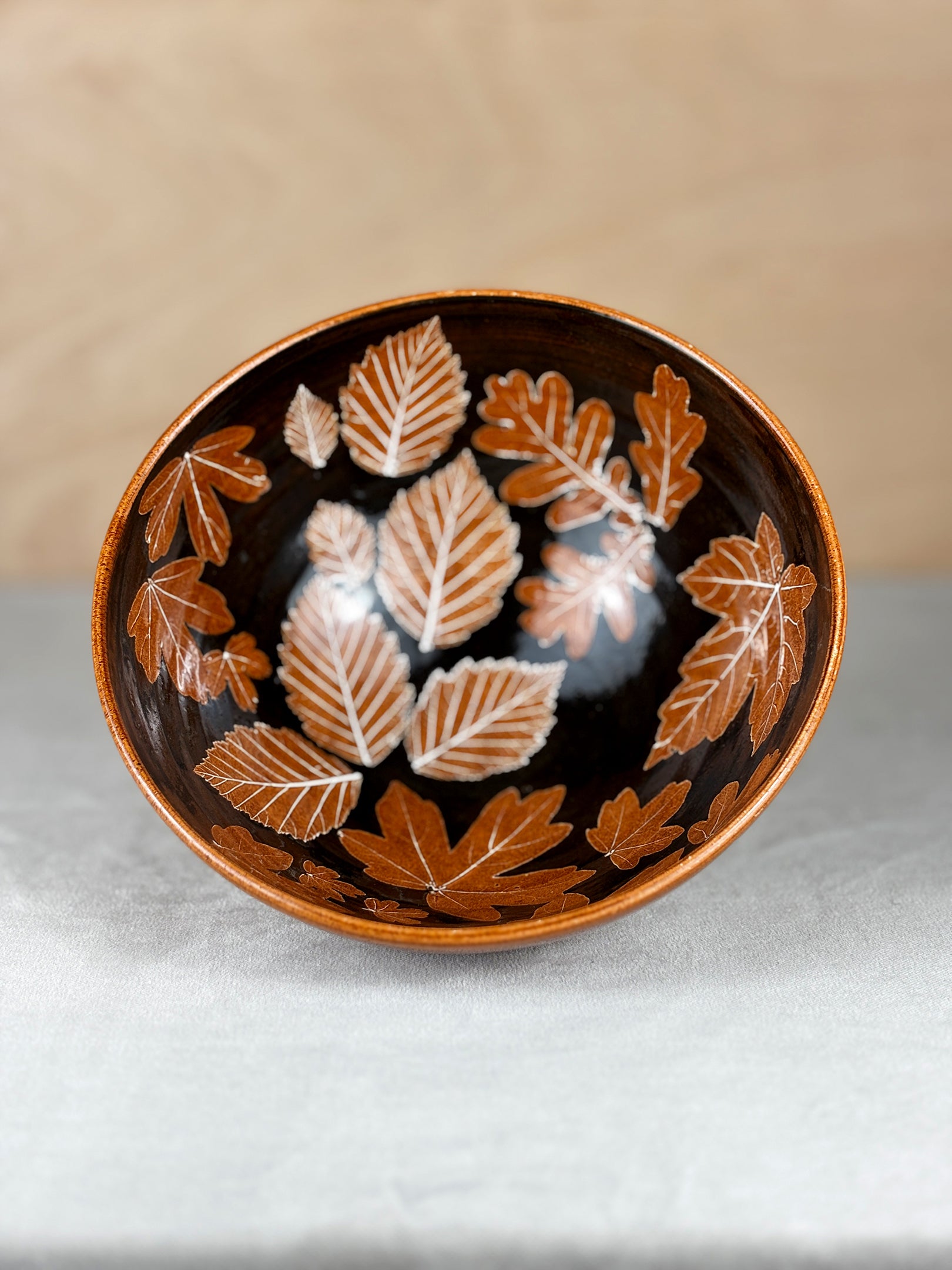 A hand-thrown studio pottery bowl by Chris Boddy, featuring a glossy dark glaze and intricate sgraffito leaf designs inside. The naturalistic leaf motifs create a striking contrast against the deep background, celebrating craftsmanship and nature-inspired design.