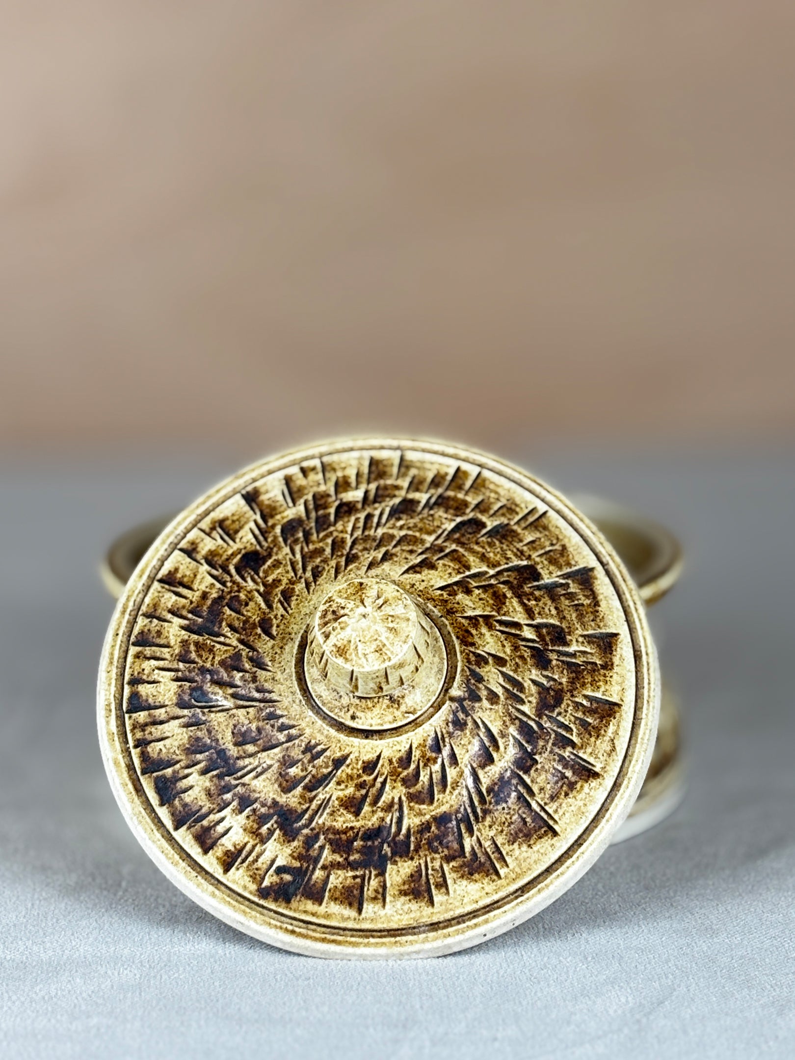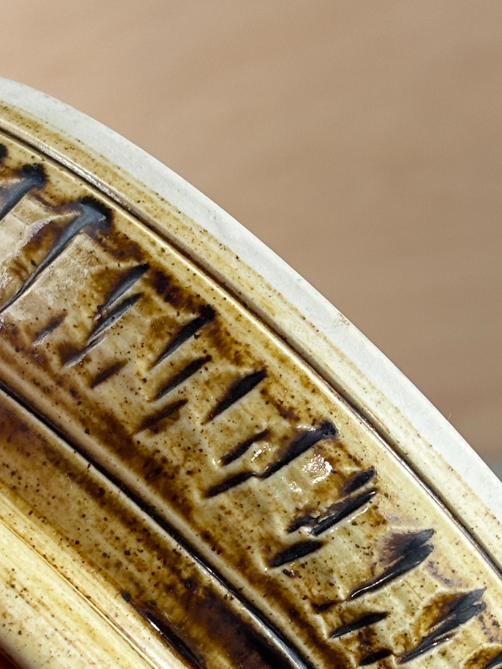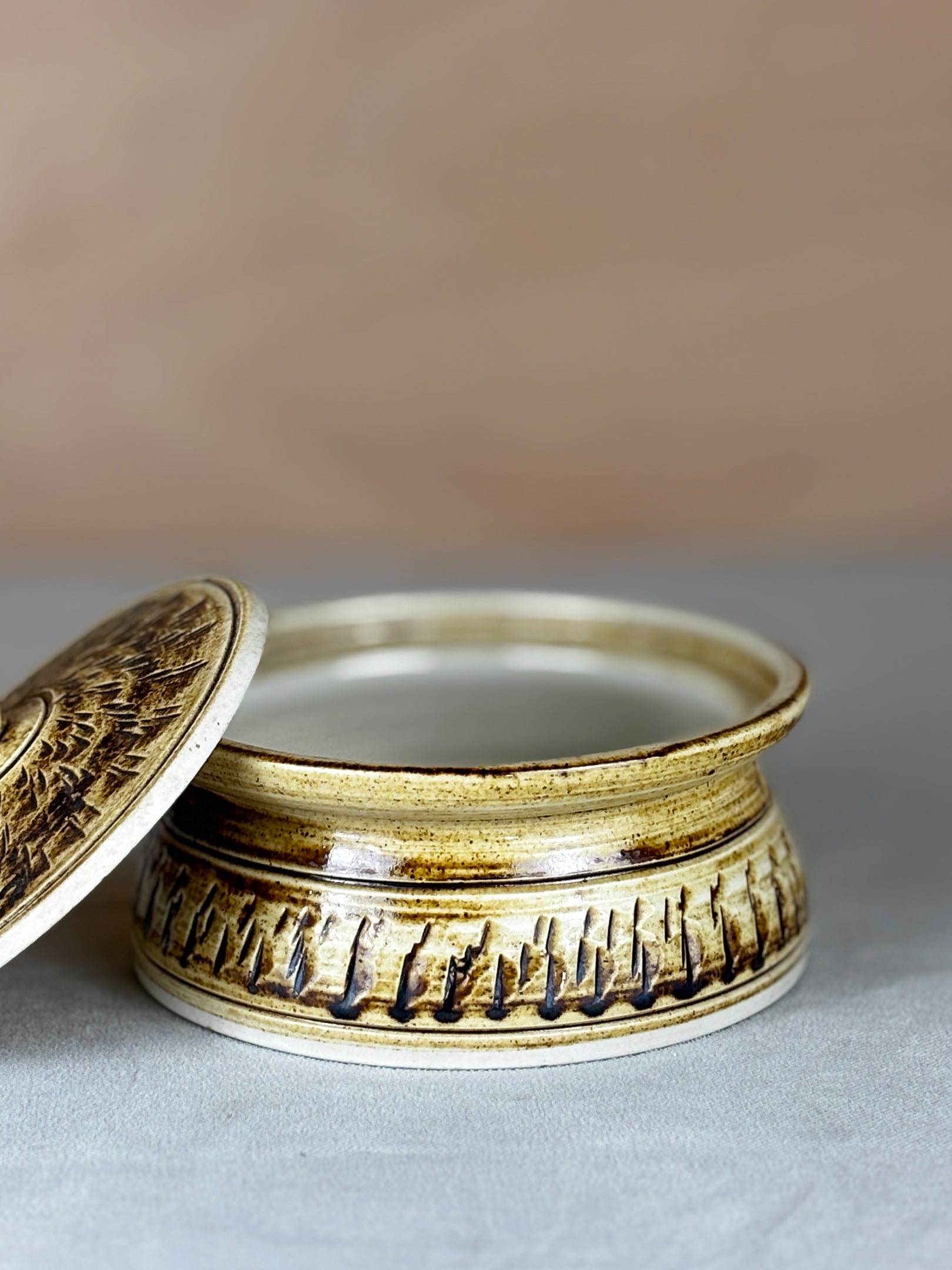 A lidded stoneware Bonchurch pot with finely incised geometric decoration and a warm, speckled glaze. The low, circular form and gently flared rim give it a calm, grounded presence, while the textured band around the body and lid adds depth and rhythm.